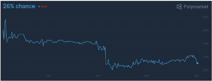 In November, the Supreme Court held hearings on the constitutionality of the Trump Administration’s use of tariffs as an “emergency power”. A majority of justices seemed inclined to side against the President. On the prediction market Polymarket, participants had been pricing in about a 40% chance that the tariffs would be upheld. That sank after the hearings and currently stands at 26%.