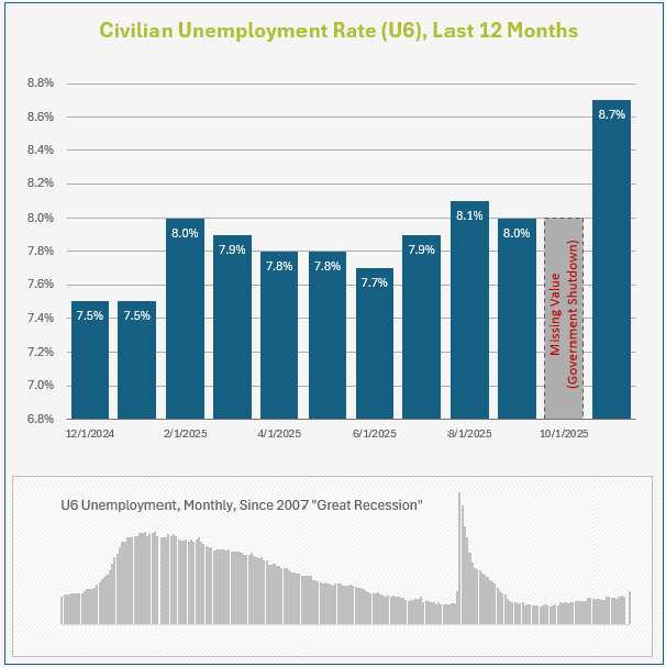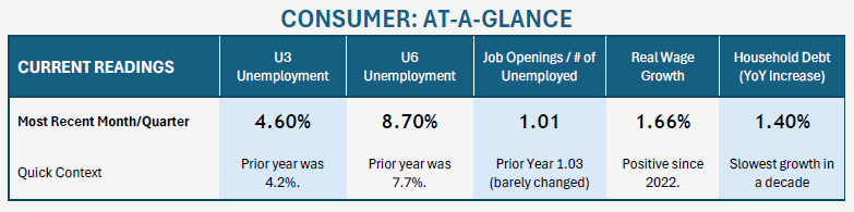 All of the datapoints combined point to a split picture: a slowly softening—though not yet alarming—labor market, paired with a consumer who remains shockingly resilient.