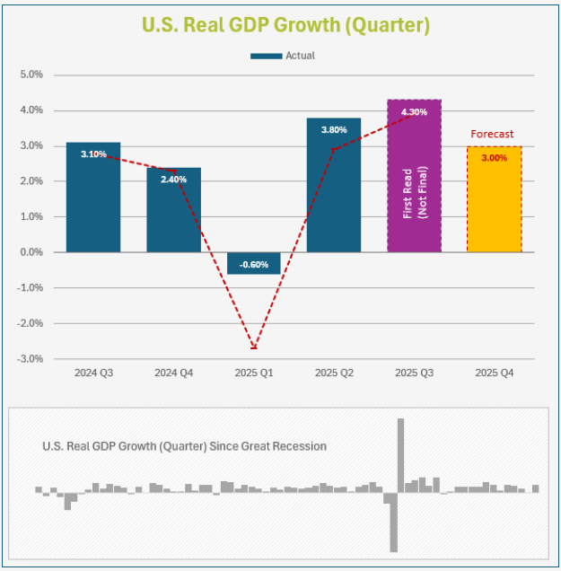 Instead of measuring only the finished goods as GDP does, Gross Output (GO) measures the total sales or receipts of all industries in the economy. This includes both final goods and services and intermediate inputs used in production. While our methodology combines an analysis of Gross Output and GDP, a recent release of GO has not been provided due to the government shutdown. Therefore, our Q4 report leans solely on GDP.