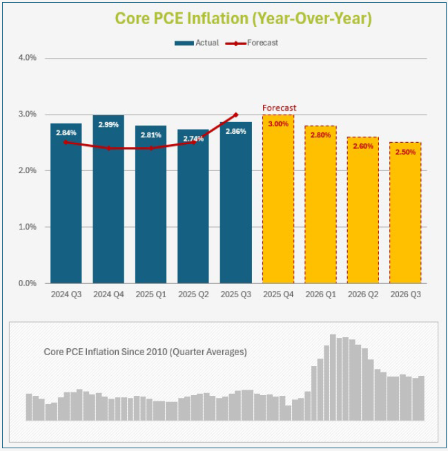 The Fed has recently initiated a series of two rounds of rate cuts (some in late-2024, some in late-2025) prior to reaching its inflation target. In our view, the Fed likely either believes that PCE inflation will resume a downward trajectory in coming quarters, or they feel that residual inflation will remain “sticky” regardless of a few quarter point cuts.