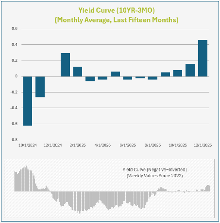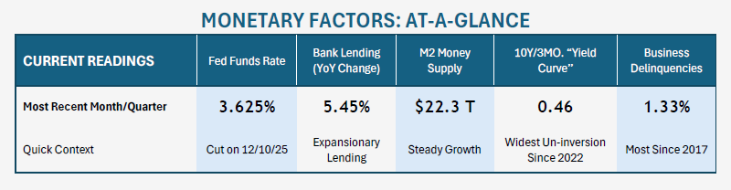 Moving into 2026, monetary indicators point toward a stable-to-improving picture for the American economy. Interest rates are dropping (which is stimulating for stocks), and, while still narrow, the yield curve is ending 2025 at the widest un-inversion in nearly three years. Bank lending remains unrestricted and money supply growth has normalized.