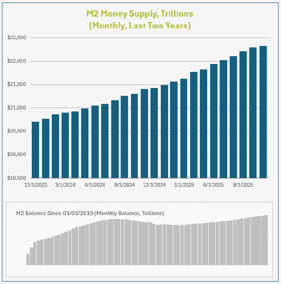 Money supply surged at unprecedented rates following the Covid pandemic, and the explosion in liquidity was a contributor to the inflation that followed (a much larger pool of money was chasing the same volume of goods). The Fed then embarked on a campaign to tighten the money supply. This largely coincided with an economy in 2022 which nearly stalled out. Since 2024, the supply has resumed increasing at a more manageable rate.