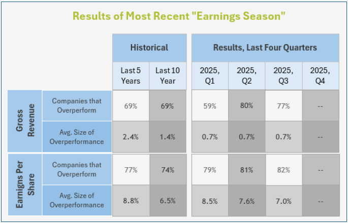 In the third quarter of 2025, 77% of companies beat Gross Revenue expectations by an average margin of 2.1%. This is far greater than performance at the beginning of the year and better than the historical averages of the last five or ten years. Where stock values climbed in 2025, these numbers explain it.